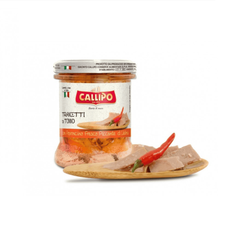En delikatess från den lilla orten Pizzo på Kalabriens kust. Tonfisk i olja med färsk peperoncini från Kalabrien. Du kan med fördel använda både den kryddade olivoljan, chilin tillsammans med tonfisken i matlagningen som en fantastisk bas till såser.