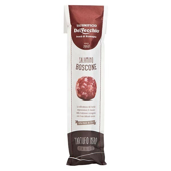 En delikat italiensk salami smaksatt med svart tryffel som med sina subtila toner tar smaken på denna salami till nya höjder. Tillverkad av Del Vecchio. Perfekt att skiva upp som antipasti eller som tilltugg på en mingelbuffe. Gör sig också mycket bra som pålägg.