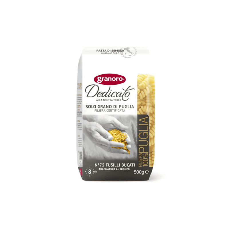 Den klassiska Fusilli kommer från Granoros "trafilatura ruvida" sortiment, vilket innebär att pastans yta har har ruggats upp vid tillverkningen som gör att såsen fäster extra väl. Den långsamma tillverkningsprocessen gör att pastan behåller sin fantastiska smak och färg även efter att den tillagats.