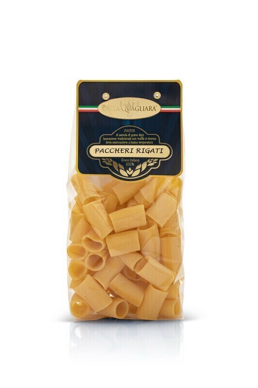 100 % italienskt vete! Quagliara väljer endast kvalitet för alla sina produkter, precis som denna Paccheri rigati. En riktigt bra basingrediens till en mängd olika pastarätter - smakar precis som på restaurang i Italien!