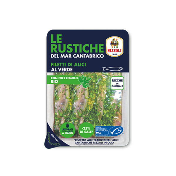 Hela sardellfiléer (MSC) inlagda i ekologisk olja, persilja och vitlök - en underbar antipasti på en bit rustikt bröd. Dessa fantastiskt goda sardeller smaksatta med persilja och vitlök är fantastiska att äta som de är och en oumbärlig ingrediens i en mängd klassiska italienska rätter.