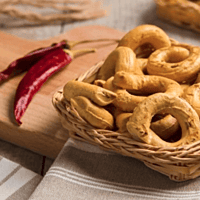 Tarallucci (eller taralli) är ett klassiskt tilltugg som passar utmärkt till all slags antipasti. Finns att få tag på i lite olika varianter över hela Italien, här i en kryddig variant med chili från Kalabrien. Den kalabriska versionen av taralli från den duktiga producenten Colacchio utanför Vibo Valentia.