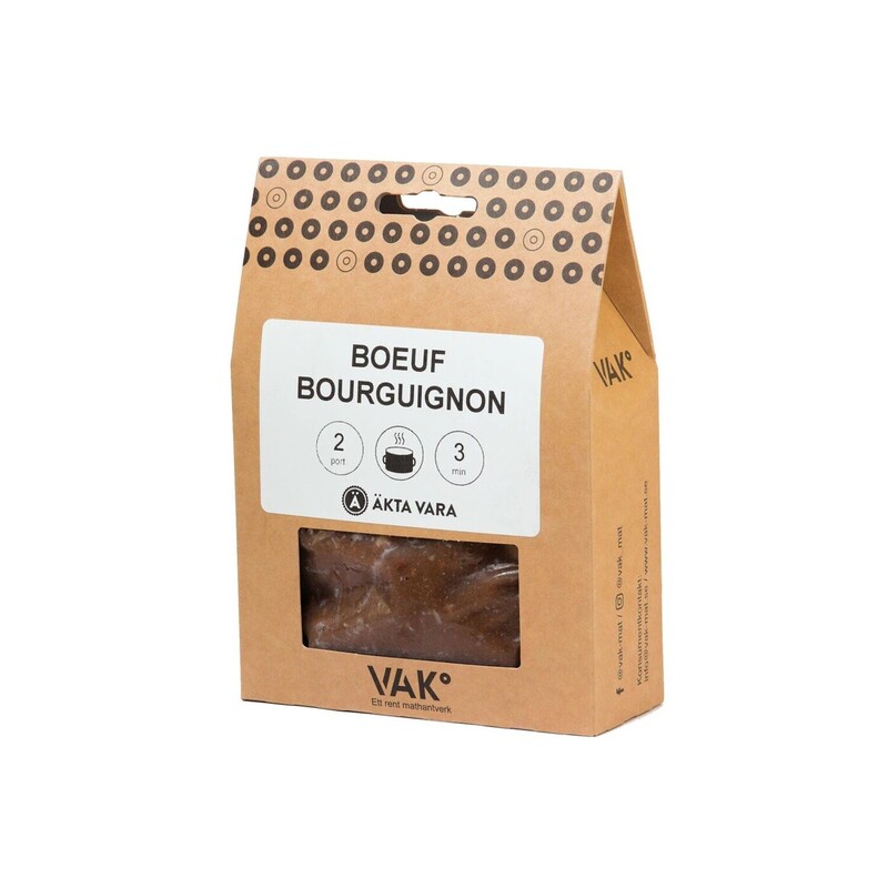 Boeuf Bourguignon från VAK° är ett kocklagat, tillsatsfritt, mathantverk färdigt att värma i gryta. Klassiskt långkok som fått djup smak av rött vin och rökt sidfläsk. Servera med potatismos eller kokt potatis och strö över färskhackad persilja. Beräknat till två portioner.