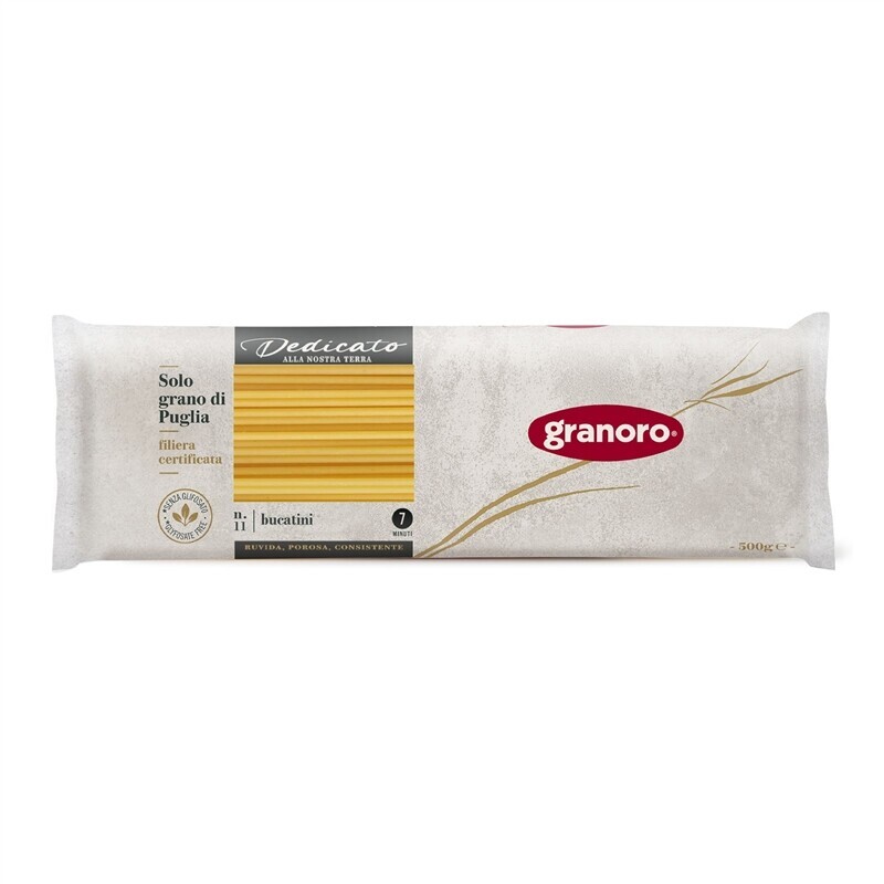 Bucatini pasta är en variant av extra långa pastastrån som är runda och tjocka. Pastan passar egentligen till de flesta såser men är framförallt bra till en tomatsås som klassikern 'Bucatini all’Amatriciana'. Från Granoros "trafilatura ruvida" sortiment, vilket innebär att pastans yta har har ruggats upp vid tillverkningen som gör att såsen fäster extra väl.