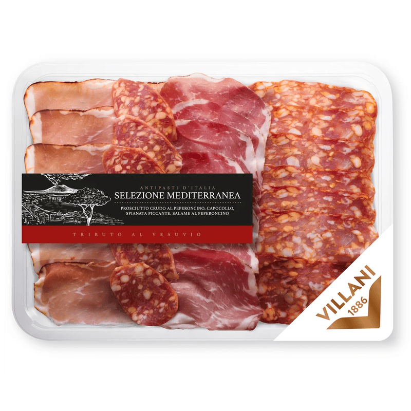 En lite kryddigare blandning av skivade charkuterier från de södra delarna av Italien med prosciutto crudo peperoncino, capocollo, spianata picante samt en salame al peperoncino. Villanis charkbricka 'Antipasto Mediterraneo' innehåller alla klassiska charkuterier från södra Italien som du kan tänkas behöva till din antipastitallrik. Bon appetito!